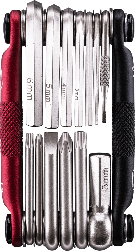 - 13 high tensile steel multi-tools, including an integrated tire plug tool